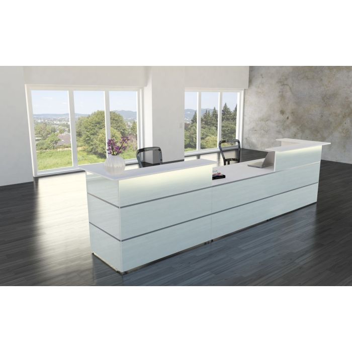 - Die Empfangstheke kann unterhalb der Ablagefläche mit einer LED-Leuchtleiste ausgestattet werden.