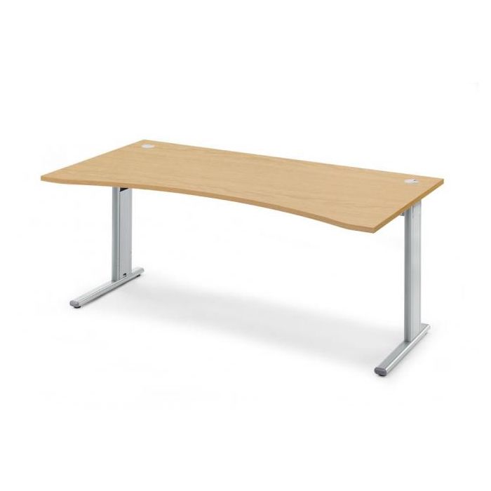 Die Arbeitsplatte in Cockpitform bietet eine ergonomisch geschwungene Tischkante mit einer erweiterten Tiefe an den Plattenrändern von 950 mm. Der dadurch gewonnene zusätzliche Ablagebereich an den linken und rechten Enden ist auch bei Sitzposition in der Mitte bequem zu erreichen. Mittig hat die Arbeitsplatte eine Tiefe von 800 mm. Die geschwungene Form lockert das Erscheinungsbild des Schreibtisches auf, der Arbeitsplatz wirkt dadurch nicht mehr so kantig.